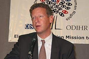 Pieter de Crem, who led the OSCE observers during parliamentary elections in Bosnia and Herzegovina, delivers the preliminary post-election statement in Sarajevo on 6 October 2002.