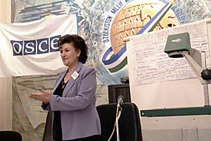 A representative of an Uzbek non-governmental organization speaks at an OSCE-organized roundtable on water management in Uzbekistan, September 2002.