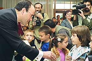 Acting Head of the OSCE Mission to FRY, Mark Davison, hands out alphabet books to school children in Belgrade, September 2002.