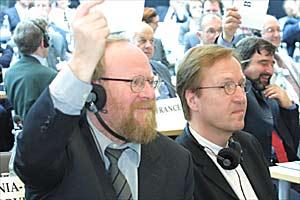 The Speaker of the German Bundestag, Wolfgang Thierse (left), voting at the 11th OSCE Parliamentary Assembly annual session in Berlin, July 2002.
