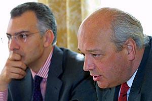 Gerard Stoudmann, Director of the OSCE Office for Democratic Institutions and Human Rights (right), and Stefano Sannino, OSCE Head of Mission, open a round table on election reform, Belgrade, 17 April 2002.