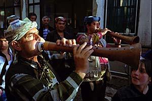 Pipers during a Gorani wedding ceremony in Restelica, South Kosovo, July 2000.