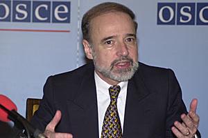 Portuguese Ambassador Joao de Lima Pimentel, Chairman of the OSCE Permament Council, speaking at a press conference, 12 April 2002.