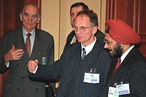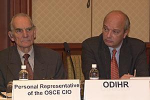 Wilhelm Hoeynck, Personal Representative of the OSCE CiO (left), and Gerard Stoudmann, Director of the OSCE Office for Democratic Institutions and Human Rights, at the Bishkek conference, 13 December 2001.