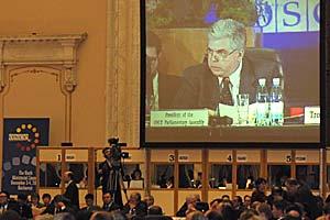 OSCE Parliamentary Assembly President Severin addressing the Ninth Ministerial Council Meeting in Bucharest, 3 December 2001.