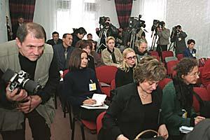 Media representatives follow the Bishkek conference proceedings, 14 December 2001.