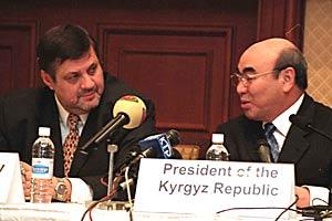 Askar Akaev, President of the Kyrgyz Republic (right), and Jan Kubis, OSCE Secretary General, at the opening of the Bishkek conference, 13 December 2001.