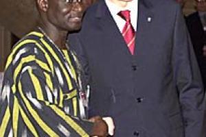 OSCE Chairman-in-Office, Mircea Geoana, welcomes UN Special Representative for Children in Armed Conflict, Olara Otunnu, to the Ninth Ministerial Council, December 2001.