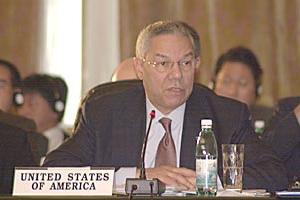 United States Secretary of State Colin Powell addresses the terrorism issue at the Ninth OSCE Ministerial Council in Bucharest, 4 December 2001.