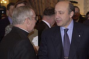 Russian Federation Foreign Minister Igor Ivanov (right) talks to the Secretary for the Holy See's relations with States, Mr. Tauran, 3 December 2001.