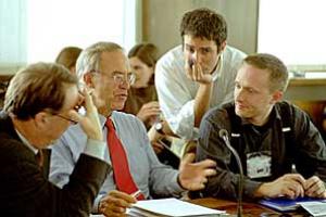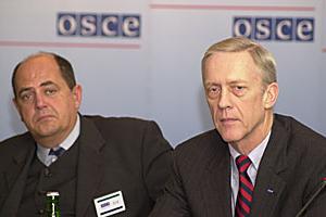 The Head of the OSCE Mission to Moldova, Ambassador William Hill (right), and his deputy, Dr. Oswald Schneidratus, present the OSCE project for weapons disposal in Moldova at a press conference, Vienna, 4 October 2001.