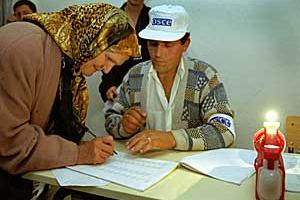 To prepare for the election of 17 November, the OSCE Mission in Kosovo staged a time and motion study at a mock-up polling station in Tudjevce/Tugjec, September 2001.