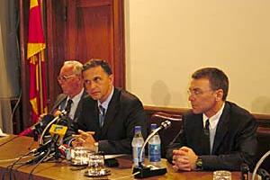 OSCE Chairman-in-Office Mircea Geoana (centre), his Personal Envoy Max van der Stoel (left), and the Head of the OSCE Mission to Skopje, Craig Jenness, at a press conference in Skopje, 4 October 2001.