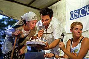 The OSCE's election road show in Klinë/Klina. The Discovery Tour mixes theatre and music to promote human rights and voter registration.