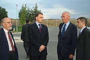 OSCE Chairman-in-Office Mircea Geoana (centre) talks to his Personal Envoy, Max van der Stoel (right), and the Head of the OSCE Mission in Skopje, Carlo Ungaro, during his visit to Skopje, 26 July 2001.