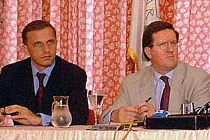 OSCE Chairman-in-Office Mircea Geoana (left) and NATO Secretary General Lord George Robertson at a press conference in Skopje, 26 July 2001.