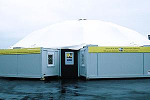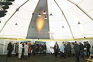 The public presentation of the project "mobile.culture.container", a tent town that travels throughout south-eastern Europe to engage young people in cultural and artistic activities, 20 April 2001.