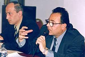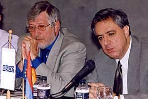 Vartan Oskanian, Armenian Foreign Minister (right), and Roy Reeve, Head of the OSCE Office in Yerevan, open the conference on democratization and law enforcement in Armenia, 17 May 2001.