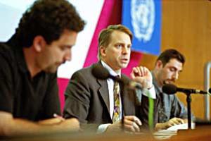 Chairman of the Economic Forum, Daniel Daianu, and Co-ordinator of OSCE Economic Environmental Activities ad interim, Marc Baltes, at a press conference at the end of the Ninth OSCE Economic Forum, 18 May 2001.