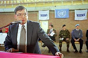 Ambassador Daan Everts, Head of the OSCE Mission in Kosovo, speaking at the rock concert marking the end of the civil registration process, Pristina Youth Centre, Saturday 15 July 2000.