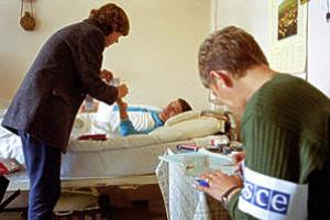OSCE staff visits hospital patients in Kosovo to enable those who cannot travel to a polling station to vote for the municipal elections, 18 October 2000.