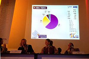 The unofficial results of 28 October 2000 Kosovo municipal elections are announced at a press conference, Pristina, 30 October 2000.