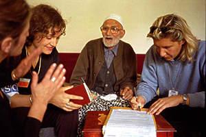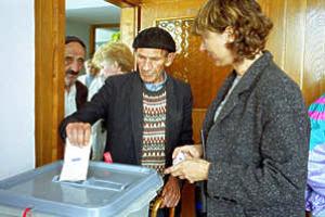 OSCE staff assists an elderly voter in Kosovo with voting procedure as part of the Special Needs Voting programme for municipal elections on 28 October 2000.