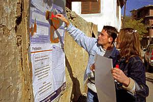 Posters with the final details on polling station locations are put up in Kosovo.
