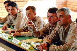 Students of the Kosovo Police Service School attend a morning class on "democratic policing in a divided society," October 1999.