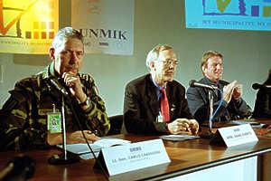 Following the close of the polls on Saturday, 28 October, a news conference was held by KFOR Commander Carlo Cabigiosu (left), OSCE Head of Mission, Daan Everts (centre), and United Nations Special Representative, Bernard Kouchner (right).