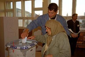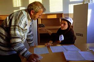 OSCE staff member assists a voter during the 28 October 2000 municipal elections in Kosovo.