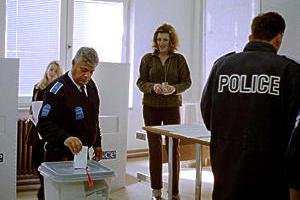 Kosovo Police Service officers cast their votes early in Kosovo with the Special Needs Voting programme, arranged by the OSCE to accommodate the officers who will be on duty on election day.