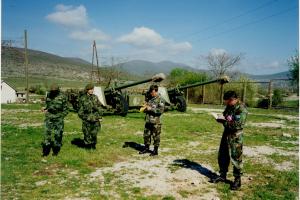 An Inspection Team from Bosnia and Herzegovina inspect the 16th Artillery Brigade in Bjelovar, Croatia in May 2001. Field Guns T 130mm M-46 are visible in the background.