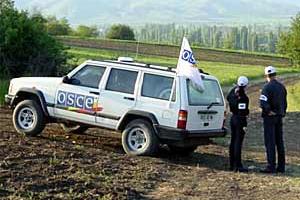 OSCE staff monitor the area west of Kumanovo, former Yugoslav Republic of Macedonia, May 2001.