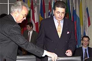 Chairman of the OSCE Permanent Council, Ambassador Liviu Bota (left), welcomes the Foreign Minister of the former Yugoslav Republic of Macedonia, Srgjan Kerim, 29 March 2001.