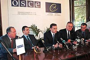 OSCE Chairman-in-Office, Romanian Foreign Minister Mircea Geoana (centre), speaks at a press conference following the opening of OSCE offices in Belgrade.