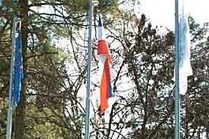 Council of Europe (left) and OSCE (right) flags are raised during the official opening of the joint office in Belgrade, 16 March 2001.