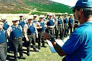 An international instructor briefs students on handgun safety rules at the Kosovo Police Service School in Vucitrn, September 1999.