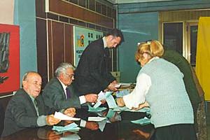 Ukrainian voters register to cast their ballots on election day, as OSCE/ODIHR staff monitors the procedure, 31 October 1999.