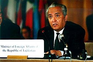 The Foreign Minister of the Republic of Tajikistan, Mr. Talbak Nazarov (centre) addresses the Permanent Council of the OSCE on 14 October 1999.