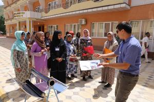 Women learning about the benefits and use of off-grid energy equipment, Jamoat Anzob, Ayni district, Soghd region, Republic of Tajikistan, 10 August 2023.