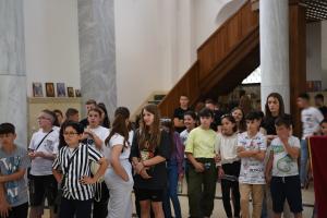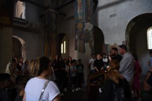 Students at the Roman Catholic Cathedral of Our Lady of Perpetual Help listen to a lecture about religion and the history of the cathedral, Prizren, 21 June 2023.
