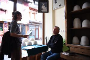 Anthropology student discusses with a shop owner in Old Bazaar the history of the shop and their work, 24 October 2023