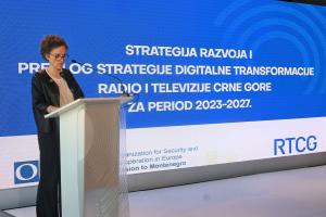 Dominique Waag, Head of OSCE Mission to Montenegro, speaking at the presentation of RTCG's two strategic documents, developed with the Mission's support, in Podgorica, 5 May 2023.