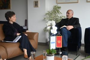 Dominique Waag, Head of the OSCE Mission to Montenegro, and Mihailo Jovović, President of the Commission for Monitoring the Actions of Competent Authorities in Investigations of Cases of Threats and Violence against Journalists, Murders of Journalists and Attacks on Media Property meeting on the occasion of World Press Freedom Day, Podgorica, 3 May 2023.
