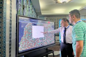 International observers examine an interactive map of polling stations during Uzbekistan's constitutional referendum. Tashkent, 30 April 2023.