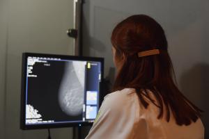 Technician Haxhere Prebreza at the computer in the mobile mammography unit, Fushë Kosovë/Kosovo Polje, 22 November 2022.