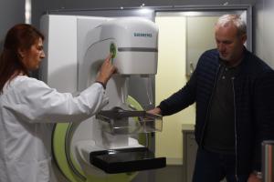 Haxhere Prebreza, technician, and Arsim Ejupi, engineer of medical equipment, prepare the mobile mammography unit for screenings, Fushë Kosovë/Kosovo Polje, 22 November 2022.