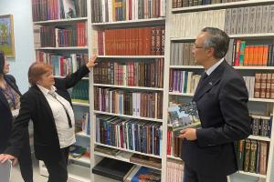 From left: Vilnius Phranciskaus Skorinos Gymnasium librarian shows OSCE High Commissioner on National Minorities Kairat Abdrakhmanov the educational facilities, Vilnius, 8 November 2022.