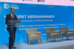 OSCE High Commissioner on National Minorities Kairat Abdrakhmanov delivers the keynote address to the conference “'Together or Apart: Searching for the Middle Ground”, 10 November 2022, Tallinn.